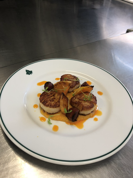 Pan seared scallops, chorizo pieces in a butternut squash puree’